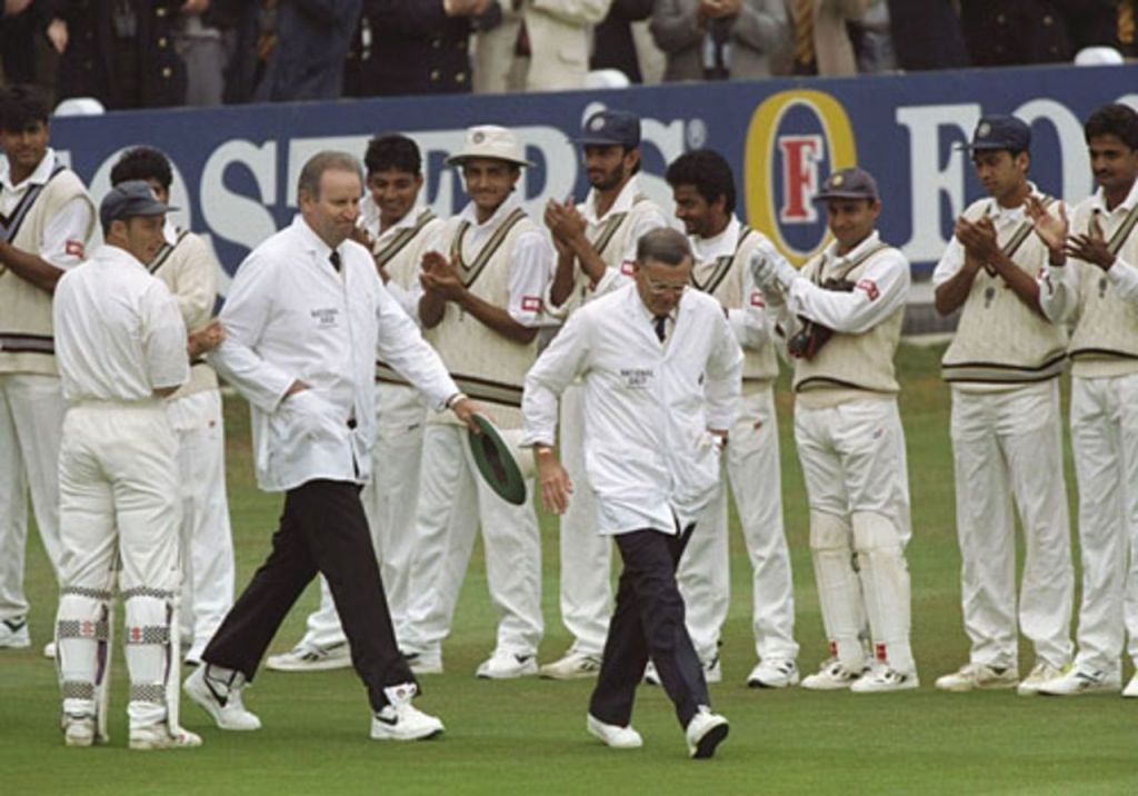 The last test match. Picture fromhttps://www.espncricinfo.com/photo/an-emotional-dickie-bird-starts-his-final-test-172740